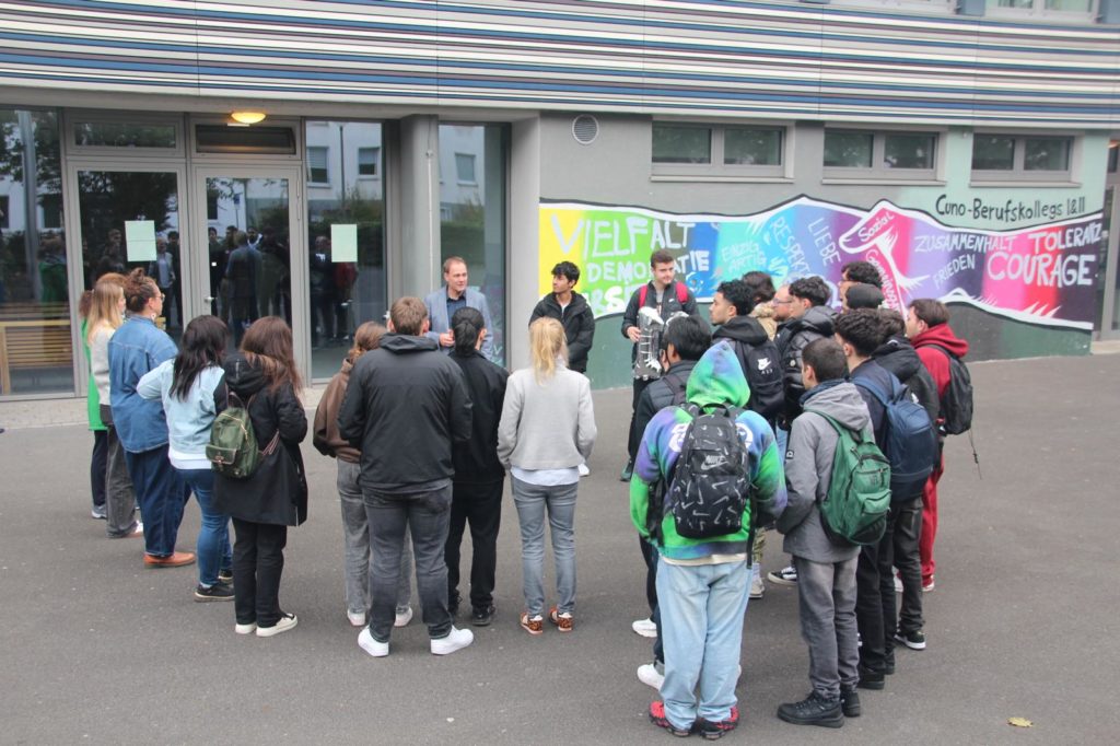 Leider müssen wir aufgrund der plötzlichen Schließung von drei unserer vier Gebäude wegen Brandschutzmängeln umplanen. In dieser schwierigen Zeit möchten wir nicht groß feiern, da der Unterricht für 3.500 Schülerinnen und Schüler stark eingeschränkt ist. Heike Hansen, unsere Sozialpädagogin, wird am 29.9 und 1.10 zwei Gewaltpräventionstrainings in zwei Klassen dank der finanziellen Unterstützung der AWO durchführen. An unserem Jubiläumstag, den 30. September 2025, kamen wir um 12:00 Uhr in einem kleinen Rahmen zusammen. Gemeinsam blickten wir mit Marion Rosenberg, unsere SoRSmC-Netzwerk-Koordinatorin vom Kommunalen Integrationszentrum, Jana Sänger von der AWO und Mitglied bei „Hagen United e.V.“, Anna Stenz vom AllerWeltHaus, dem SoRSmC-Team , Thomas Luig, Schulleitung des Cuno-BK I, sowie ein paar Schülerinnen und Schülern auf die Aktionen der letzten Jahre im SoRSmC-Netzwerk zurück und schauten optimistisch in die Zukunft. Thomas Luig sagte: „Ich freue mich auf weitere 10 Jahre SoRSmC an unserer Schule“.